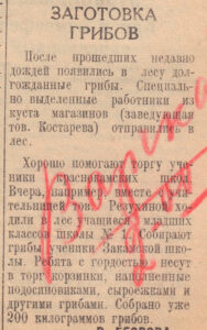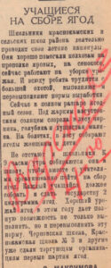 Школьников Краснокамских и сельских школ района привлекают для сбора дикорастущих плодов, ягод и грибов. Продукты сдавали в заготовительные организации (трест, сельпо) и в колхозы для дальнейшей переработки. Каждый учащийся должен собрать и сдать государству 2 килограмма ягод. Дети стараются по мере своих сил сделать все, чтобы помочь стране: собирают металлолом, собирают лекарственные растения, ягоды можжевельника, шиповника. (Ф.57. Оп.1. Д.9. Л.64,76 об.,103)