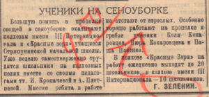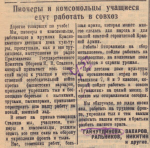 Пионеры и учащиеся идут работать в колхоз для прополки овощей, сбора и охраны урожая. Большую помощь в уборке сена оказывают колхозу «Красные зори» учащиеся Стряпунинской начальной школы. При Краснокамском детском доме культуры организован отряд из 50 учащихся 7,8 и 9 классов, который пойдет работать в совхоз «Бумажник» на целый месяц с 06 июля 1941 г. Ученики 8 и 9 классов средней школы № 1 вручную копают картофель в совхозе «Новый мир» Стряпунинского сельсовета. (Ф.57. Оп.1. Д.9. Л.9 об.,91 об.,30)