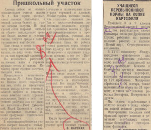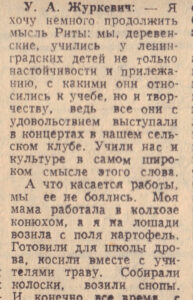 Ученица Черновской школы У. А. Журкевич воспоминает: «Моя мама работала в колхозе конюхом, а я на лошади возила с поля картофель. Готовили для школы дрова, косили вместе с учителем траву. Собирали колоски, возили снопы». (Ф.85. Оп.1. Д.25. Л. 1.)